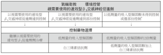 | 日間症狀:喘鳴、 咳嗽、呼吸有困難 | 無 (每週少於2次,通常僅持續以分鐘計的短暫時間,且在使用速效型支氣管擴張劑後即快速緩解) | 每週多於2次 (通常僅持續以分鐘計的短暫時間,且在使用速效型支氣管擴張劑後即快速緩解) | 每週多於2次 (通常持續數分鐘或數小時,或為復發性,但於服用速效型支氣管擴張劑後可部份或完全緩解) |