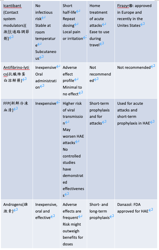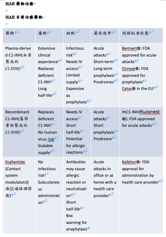 目前台灣可以引進的部份HAE治療藥物的詳細介紹