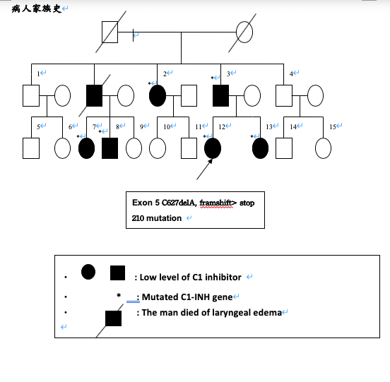 一位 16歲小女孩因為最近兩年來發生無數次不明原因的臉部水腫而從外面的診所轉介至馬偕小兒過敏免疫科來做進一步的追蹤與治療。根據病人描述每次發生水腫的期間大約持續3至7天,且病人的伯父在三十多歲時因為突發性的喉頭水腫窒息而死亡。病人的伯父在生前也曾發生無數次的臉部與喉頭不明原因的血管水腫。在實驗室診斷上我們發現這位16歲小女孩血清內的補體C4 <10 mg/dL,C3:111mg/dL, C1 easterase inhibitor:6.5mg/dL,我們把病人整個家族做血清的C1 esterase inhibitor 濃度發現家族中尚有五位親戚也有C1 easterase inhibitor 低下的情況。