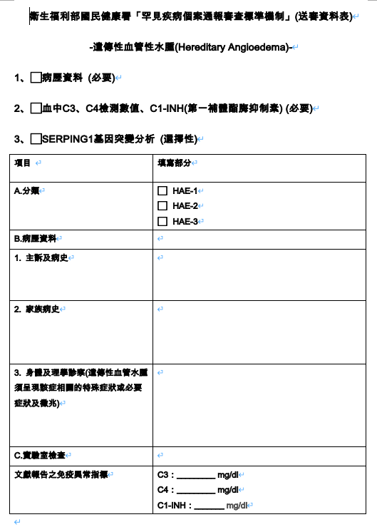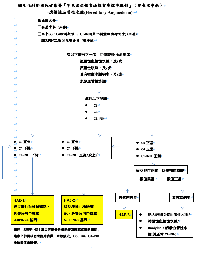 我們最初篩檢臨床呈現反覆性血管性水腫疑似患者的C3和C4血清濃度,如果病人顯示正常的C3血清濃度但是低下的C4血清濃度,則病人可能是第一型或第二型遺傳性血管水腫病人,我們會繼續進行C1-INH 的檢查。如果C1-INH血清濃度下降則為第一型HAE病人;如果C1-INH血清濃度正常則可能為第二型遺傳性血管水腫病人,接著我們可以進行 C1-INH的功能活性檢查來確定診斷是否為第二型遺傳性血管水腫病人。對於第一型及第二型的病人我們也可以進行遺傳性血管水腫病人的SERPING1基因序列突變分析來確定診斷。台灣目前沒有診斷HAE nC1-INH的病例,再加上我們目前也沒有辦法進行HAE nC1-INH和factor XII (FXII)、angiopoietin (ANGPTI)、plasminogen (PLG)或kininogen (KNG)的基因突變檢查,所以在衛生福利部國民健康署「罕見疾病個案通報審查標準機制」(審查標準表)的遺傳性血管性水腫診斷流程中,我們仍將有遺傳家族史(家中至少有兩位患者有反覆性血管性水腫)且本人臨床呈現反覆性血管性水腫的患者,如果病人的血液檢查顯示正常的C3、C4和C1-INH血清濃度,我們目前先暫時診斷定名為第三型遺傳性血管性水腫病人。