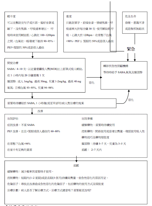 這些治療計畫應根據病人的症狀與肺功能情況(成人)調整,若病人有症狀惡化快 速狀況下,應了解最近可就醫的地點