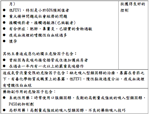 - 任何氣喘症狀加上任何導致惡化的危險因子(例如:最近12個月內需要使 用到口服類固醇作為氣喘治療、低的第一秒用力呼氣量、曾因氣喘住進加護 病房)。 如果患者在大多數日子裡有較為棘手的氣喘症狀,或者一個星期中因氣喘而醒來 大於或等於一次,特別是如果有任何誘發惡化的風險因素存在時,就該考慮以較 高階的方式開始治療(例如:中/高劑量的吸入型類固醇,或吸入型類固醇/長效 乙二型交感神經興奮劑)。 如果一開始就以嚴重難以控制的氣喘來表現,或是急性的氣喘發作時,可給予短 程的口服類固醇治療,並開始規則的控制藥物治療(例如:高劑量的吸入型類固 醇,或中劑量吸入型類固醇/長效乙二型交感神經興奮劑)。