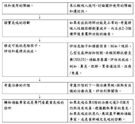 - 對於嚴重氣喘的病人:轉介到專科中心,如果有的話,考慮附加藥物和/或 痰引導治療