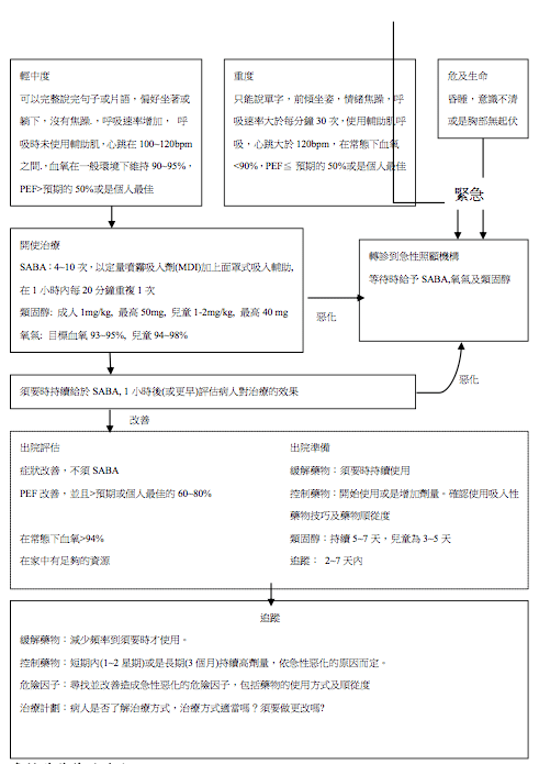 回顧治療後的反應 就近且頻繁的監測病童在治療當中的狀況,依治療後的反應調整治療的方式。若 病患對治療無效或是症狀加劇時應轉到後線醫院。 評估病人是否需要住院。依照臨床症狀、肺功能、對治療的反應、最近及以前急 性發作的病史,及在家照護的能力,評估病人是否需要住院。 在出院前安排後續的治療。對於大多數的病人,開立常規的控制藥物(或是增加 目前控制藥物的劑量),以減少急性發作的進一步傷害。在 2~4 個星期內持續增 加控制藥物的劑量,並逐漸減少緩解藥物的劑量到必須時才使用。確認患者使用 吸入性藥物的方式及使用藥物的順從性。提供患者臨時的書面治療計劃。 安排早期回診。對於急性惡化的患者,最好安排一個星期內的回診。 若患者須要住院或是多次到急診就醫時,考慮轉介病患給專科醫師。