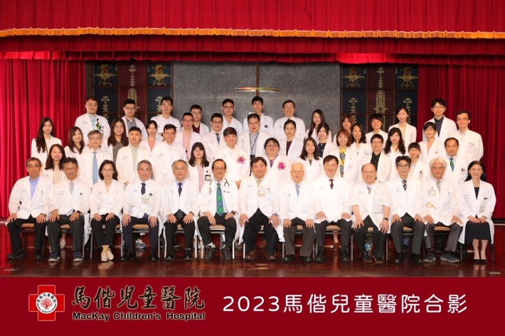 民國112年6月15日在馬偕紀念醫院九樓大禮堂進行馬偕兒童醫院兒科醫師的合照。