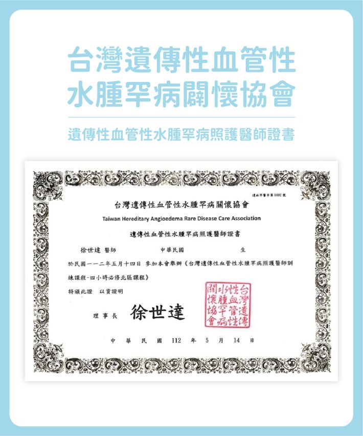擁有遺傳性血管性水腫罕病照護醫師證書同時可以根據醫師個人意願,登錄醫師個人服務診所或醫院資料在協會臉書上,讓遺傳性血管性水腫病人有機會找到適合的醫師,獲得最好的罕病醫療服務。